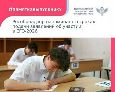📝 Рособрнадзор напоминает: заявление об участии в ЕГЭ-2026 нужно подать до 1 февраля. Поскольку 1 февраля – воскресенье, срок подачи заявления продлевается до 2 февраля включительно. Выпускники текущего года подают заявление в свою школу, а экстерны – в любую школу с государственной аккредитацией. Выпускники прошлых лет регистрируются в местах, утвержденных региональными органами управления образованием. Информацию об этих местах можно найти на официальных сайтах региональных органов управления образованием. 📍Заявление подают лично обучающиеся или их родители (законные представители) на основании документа, удостоверяющего личность. Также заявление могут подать уполномоченные лица на основании документа, удостоверяющего личность, ... Читать дальше » |